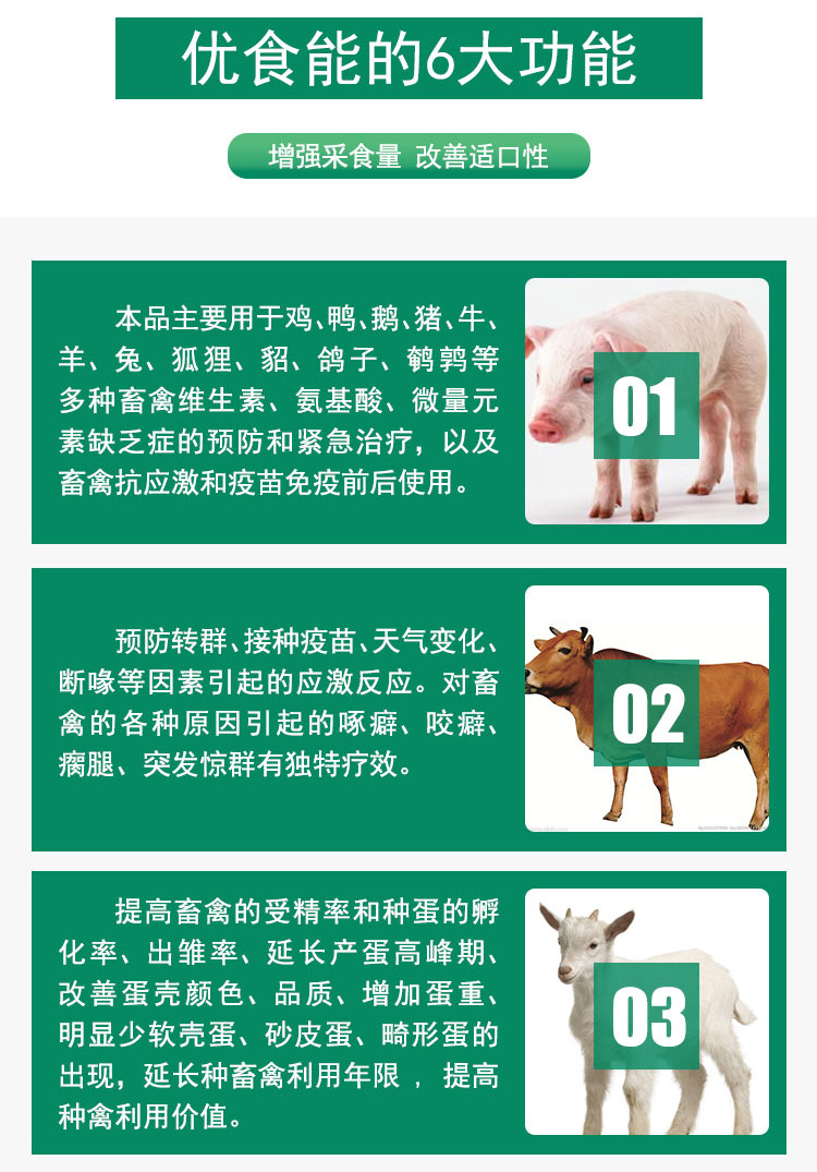 1、明顯提高畜禽采食量,補充畜禽所需的各種營養。調節機體各器官功能,維持代謝平衡