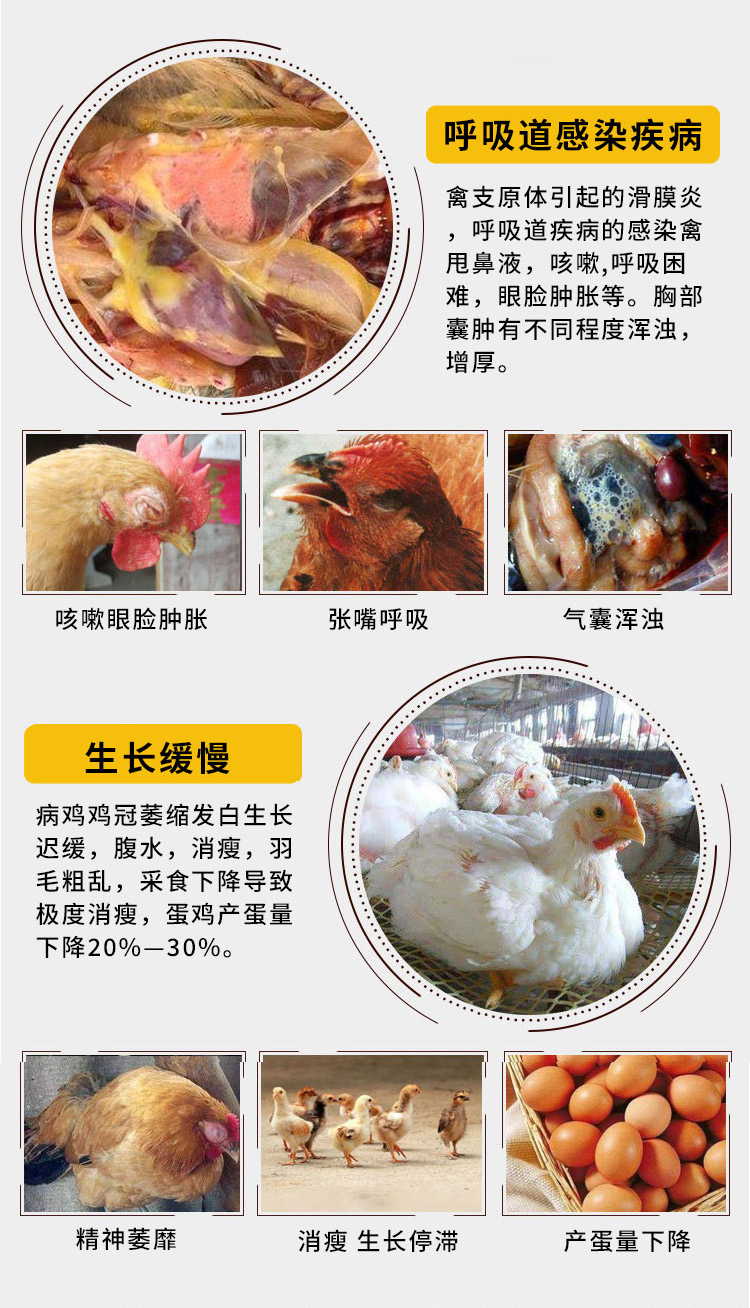 1、用于禽滑液囊支原體:可見:消瘦、脫水、生長停滯,食欲下降,腱鞘炎、滑膜炎、關節炎,胸骨皮下囊腫等。