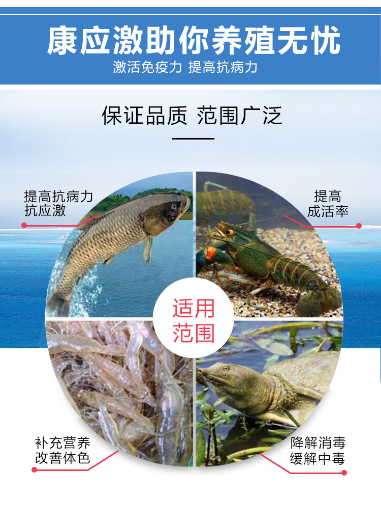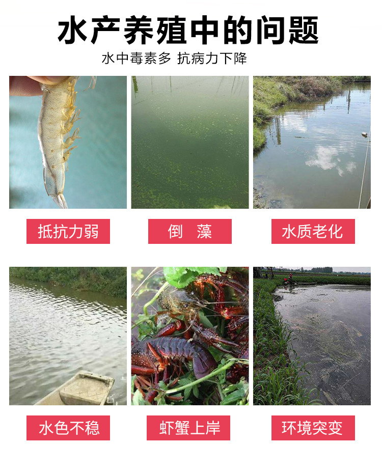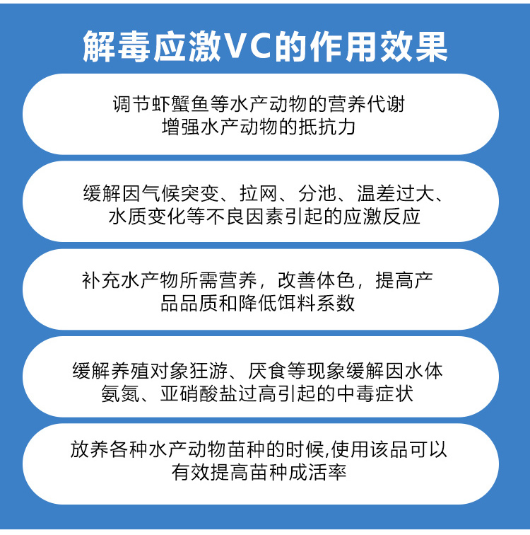 產品簡介:調節蝦蟹魚等水產動物的營養代謝增強水產動物的抵抗力 緩解因氣候突變、拉網、分池、溫差過大水質變化等不良因素引起的應激反應。
