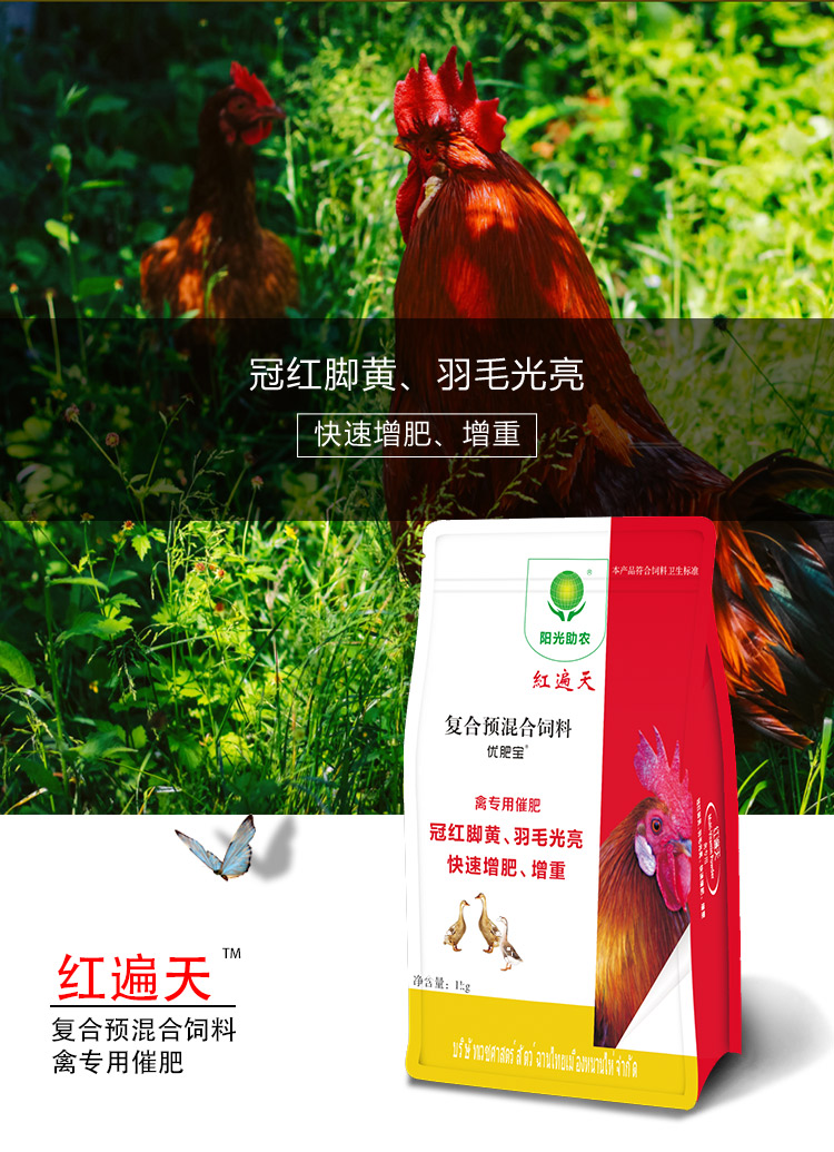快速增重、冠紅腳黃、羽毛光亮、快速催肥