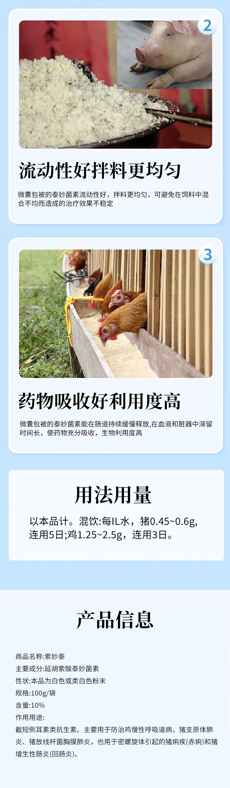 產品簡介:主要用于防治豬支原體肺炎、放線桿菌胸膜肺炎 密螺旋體性痢疾;離的饅性呼吸道病、支原體引起的關節炎等
