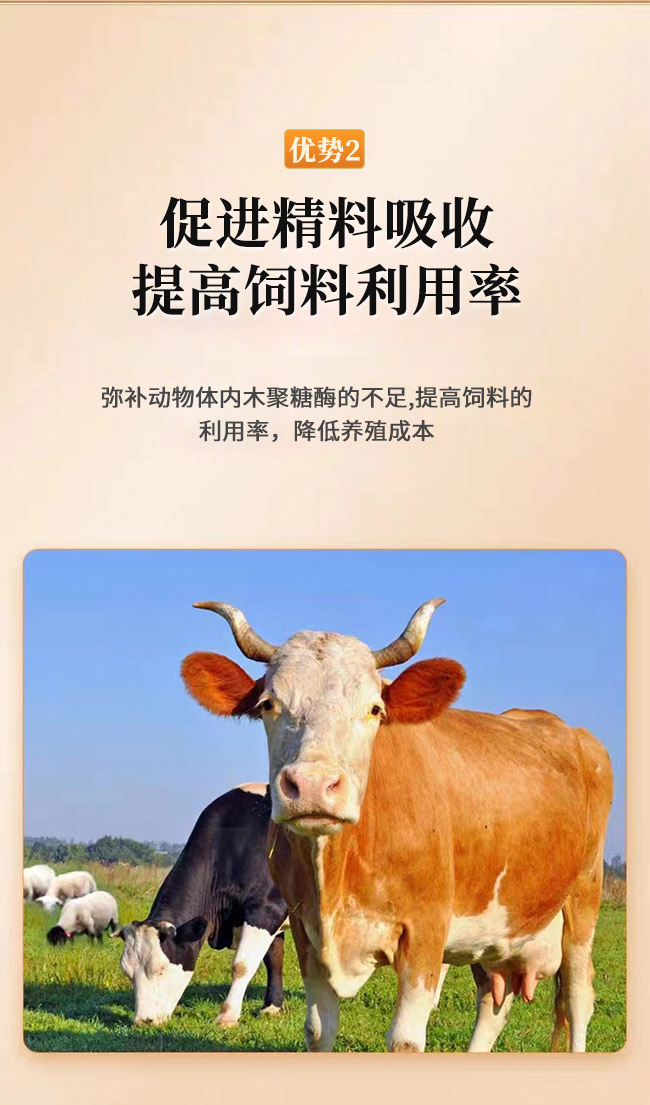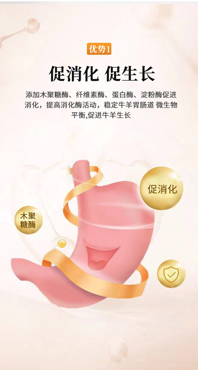 添加木聚糖酶、纖維素酶、蛋白酶、淀粉酶促進消化,提高消化酶活動,穩定牛羊胃腸道微生物平衡,促進牛羊生長
