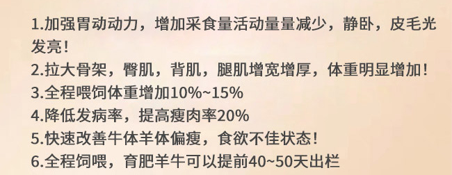 產(chǎn)品簡介:超硬加固型 牛羊提前出欄 加速生長 多礦物質(zhì) 促肥增長 微量元素高鈣 拉長骨架 增肥增重 免疫增強(qiáng)